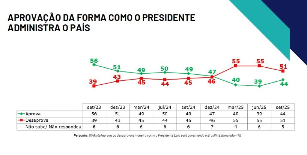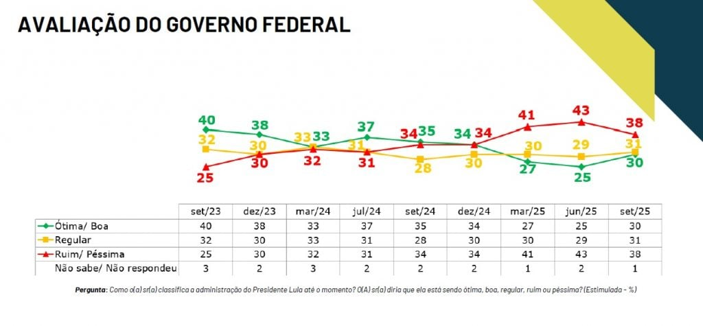 A avaliação positiva registra crescimento mais significativo entre quem declara ter votado em Lula na eleição de 2022, variando de 53% para 61% agora em setembro; e entre moradores da região Nordeste, onde passa de 38% para 46%, no mesmo período.