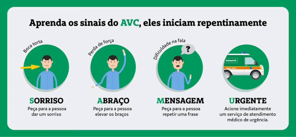 De acordo com o Ministério da Saúde, o AVC acontece quando vasos que levam sangue ao cérebro entopem ou se rompem, provocando a paralisia da área cerebral que ficou sem circulação sanguínea. O quadro acomete mais homens e, quanto mais rápido for o diagnóstico e o tratamento, maiores as chances de recuperação.