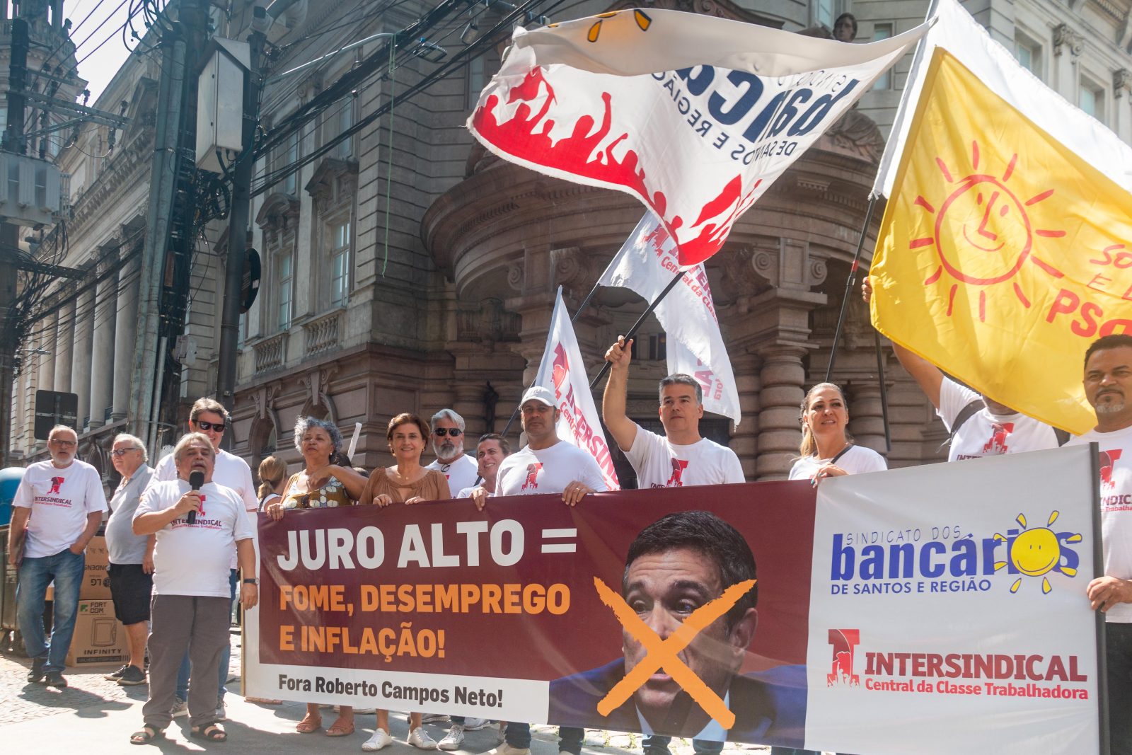 A Intersindical Central da Classe Trabalhadora, a diretoria do Sindicato dos Bancários de Santos e Região em conjunto com o PSOL, movimentos políticos e sociais realizaram protesto contra a manutenção da alta de juros (taxa Selic em 13,75%) pelo Banco Central (BC),dia 03 de maio, em frente a Bolsa do Café, Centro Histórico de Santos/SP.