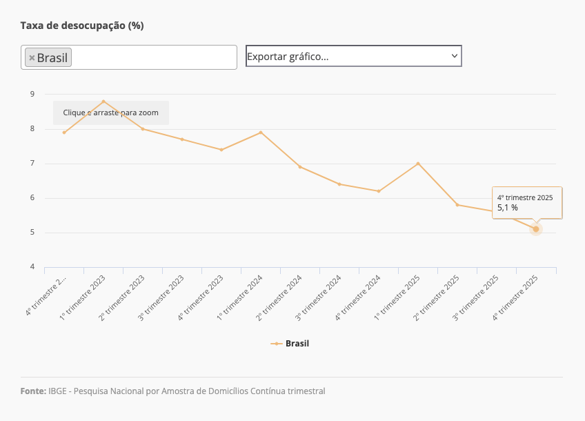 O desemprego continuou sua trajetória de queda em 2025. A taxa anual foi de 5,6%, a menor desde 2012 — em 2024, era de 6,6%. Quando analisado somente o quarto trimestre, o recuo também foi significativo: o desemprego saiu de 5,6% para 5,1% na comparação com os três meses anteriores (no mesmo período de 2024, a taxa era de 6,2%). Ao todo, 20 unidades da federação atingiram a menor taxa de desocupação da série histórica.