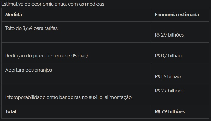 A pasta calcula que a economia média pode chegar a R$ 225 por trabalhador ao ano, com a redução de custos e maior competitividade entre as empresas operadoras dos benefícios. A economia irá para supermercados, bares e restaurantes, mas o governo espera que os custos menores sejam repassados aos consumidores.