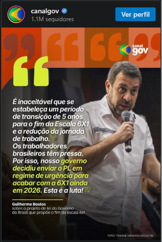 “É inaceitável que se estabeleça um período de transição de 5 anos para o fim da Escala 6X1 e a redução da jornada de trabalho. Os trabalhadores brasileiros têm pressa. Por isso, nosso governo decidiu enviar o PL em regime de urgência para acabar com a 6X1 ainda em 2026. Esta é a luta!”, disse Boulos na última semana.