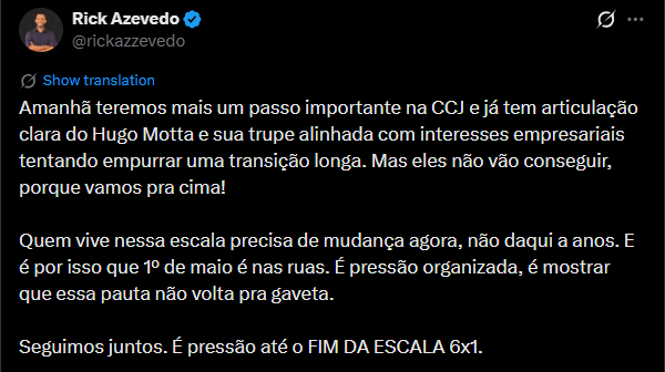 O vereador carioca Rick Azevedo, idealizador da proposta que inspirou a PEC apresentada por Erika Hilton (PSOL-SP), denunciou publicamente uma articulação liderada pelo presidente da Câmara, Hugo Motta, junto ao Centrão.