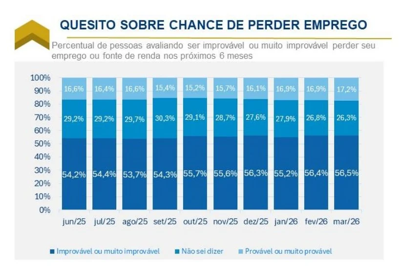 As informações constam na décima edição dos Indicadores de Qualidade do Trabalho da Sondagem de Mercado de Trabalho. Segundo os dados do trimestre encerrado em março de 2026, 56,5% dos respondentes consideram improvável ou muito improvável perder o emprego ou fonte de renda nos próximos seis meses.