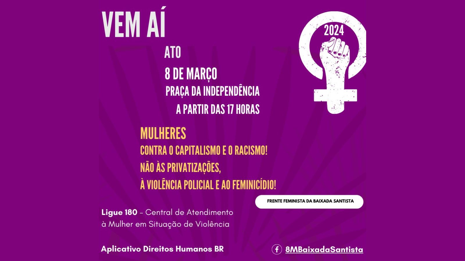 Concentração no dia 8 de Março, Dia Internacional das Mulheres, será na Praça da Independência, em Santos, a partir das 17h, e ato às 19 horas, na Praça das Bandeiras.