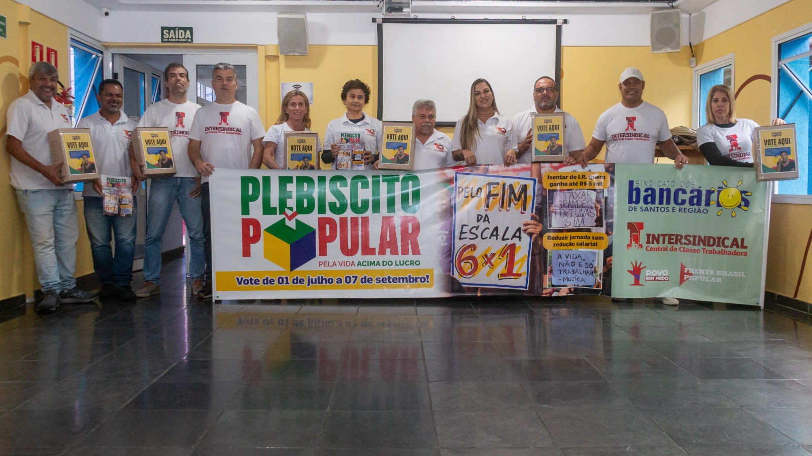 As frentes Povo Sem Medo e Brasil Popular, CNBB, intersindical Central da Classe Trabalhadora, Sindicato dos Bancários de Santos e Região entre outras entidades e movimentos sociais são organizadoras do plebiscito popular para ouvir a população brasileira, de julho a setembro de 2025, sobre o fim da escala 6×1, redução da jornada de trabalho, isenção de imposto de renda para quem ganha até 5 mil reais e a taxação dos super-ricos.