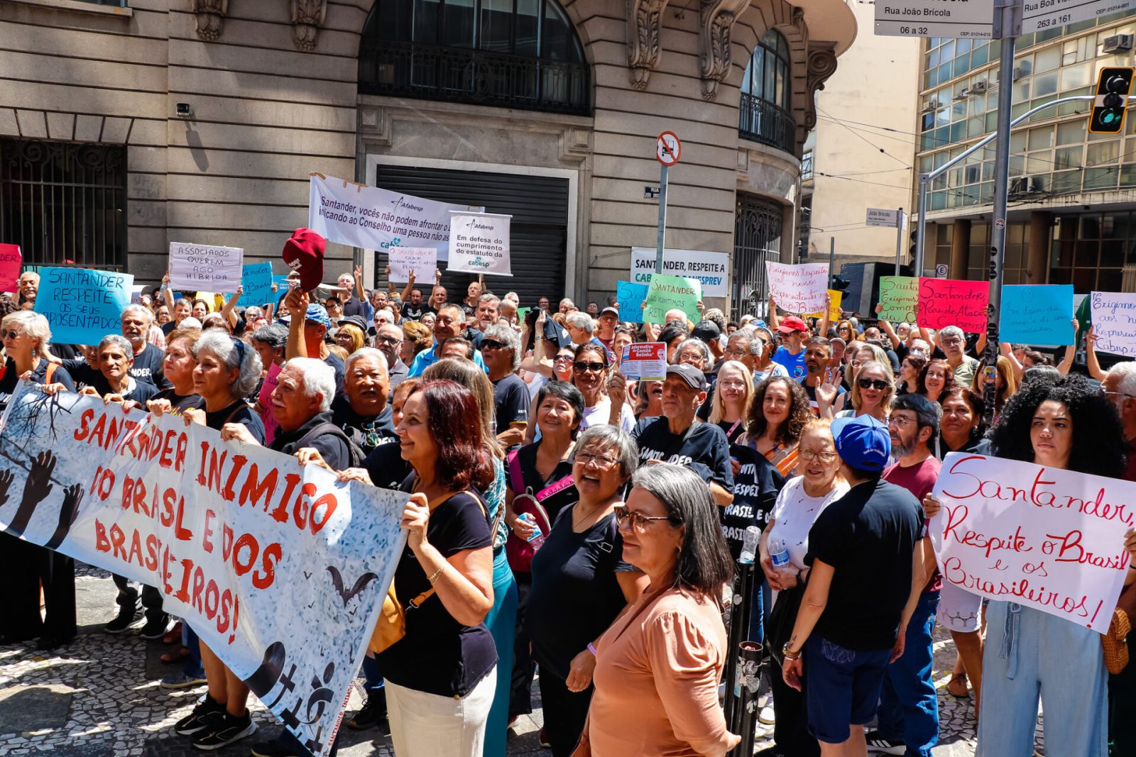 Unidos, eles vaiaram a atuação da presidente da Cabesp, que também comanda o Conselho Deliberativo do Banesprev, abraçaram simbolicamente o prédio para mostrar ao Santander que estão vigilantes e não vão aceitar os desmandos de indicados do banco dentro das entidades que são dos banespianos.